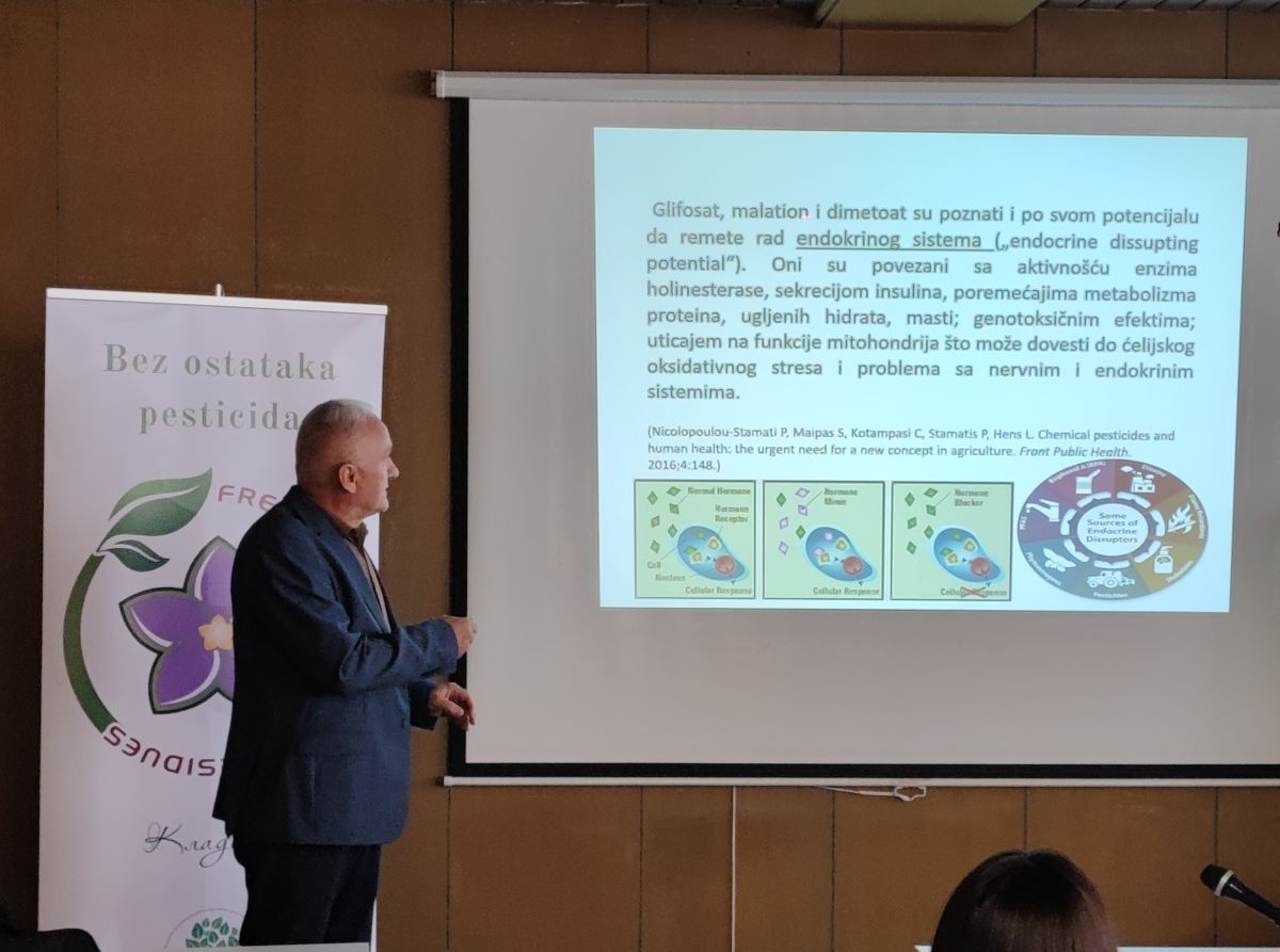 Уводно предавање о утицају пестицида на човека и животну средину је одржао Проф. др Слободан Миленковић са Educons универзитета. Као осведочени практичар у пољопривредној производњи и научни радник, Проф. др Миленковић је низом примера из праксе и различитих истраживања показао различите ефекте пестицида на животну средину (земљиште, вода, ваздух), живи свет (инсекти, животиње и сл.) и човека.